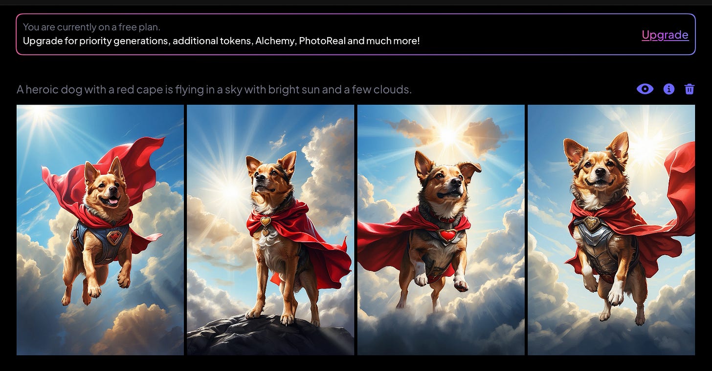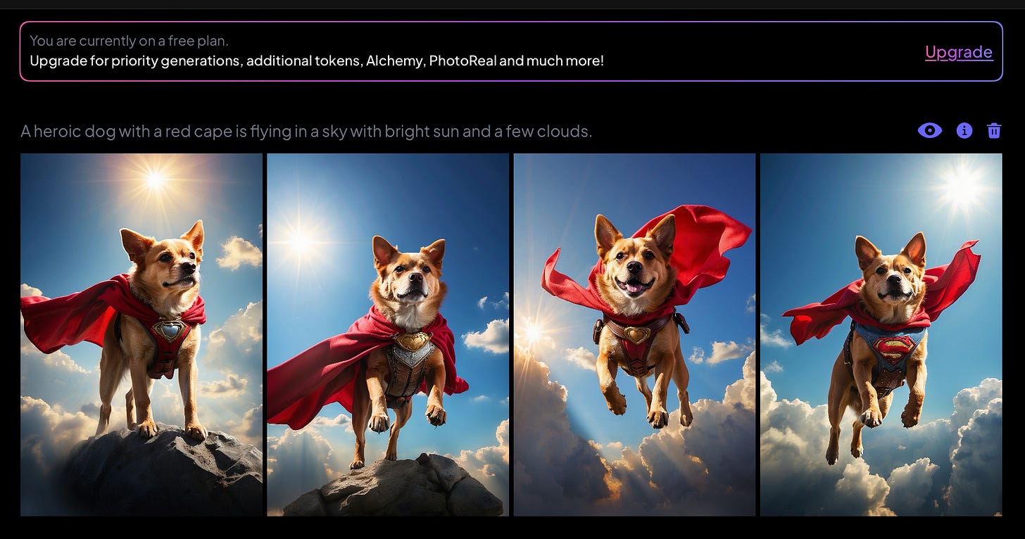 I also prompted it to generate a “SuperDog” coming to rescue the world, with this prompt: