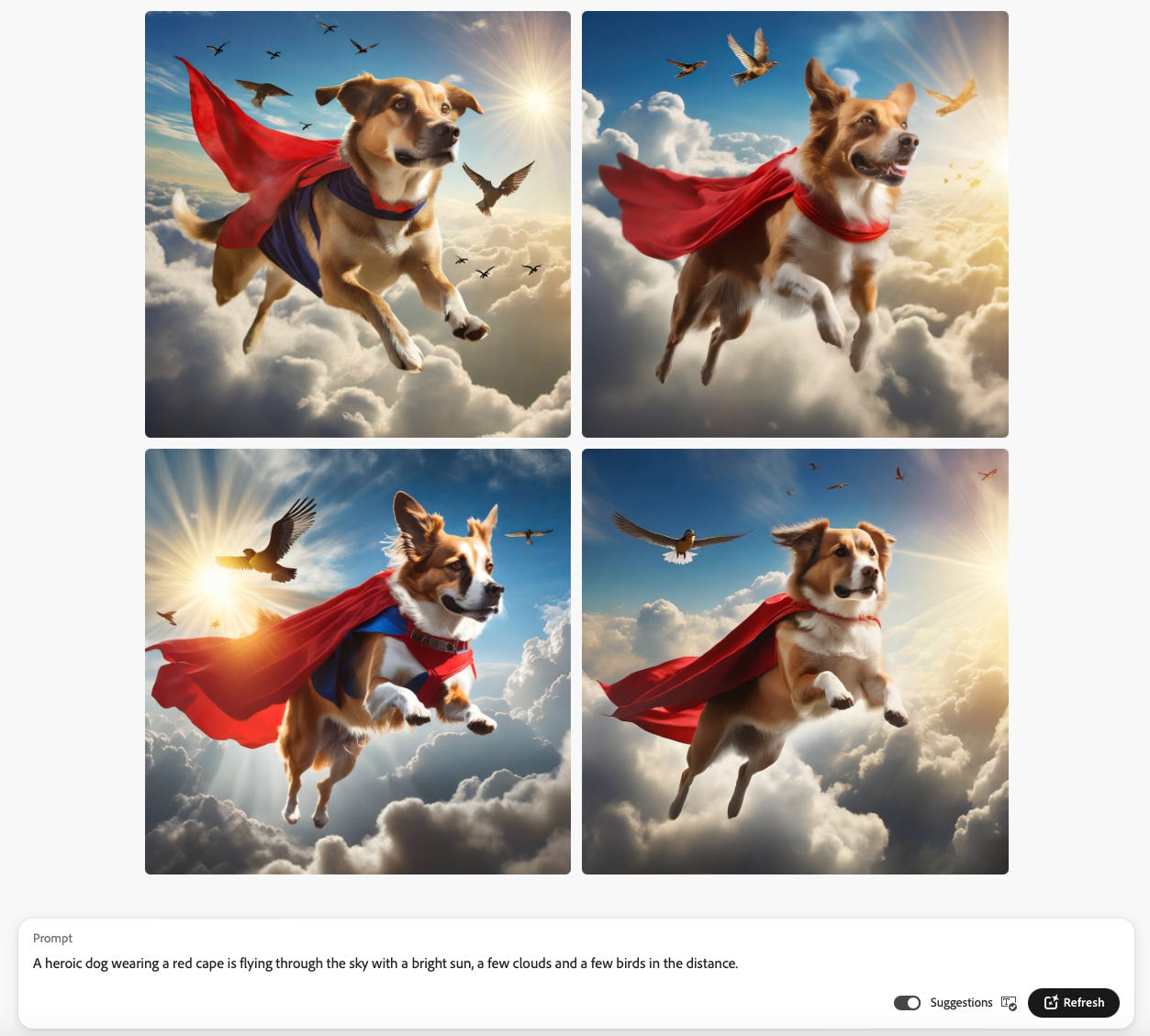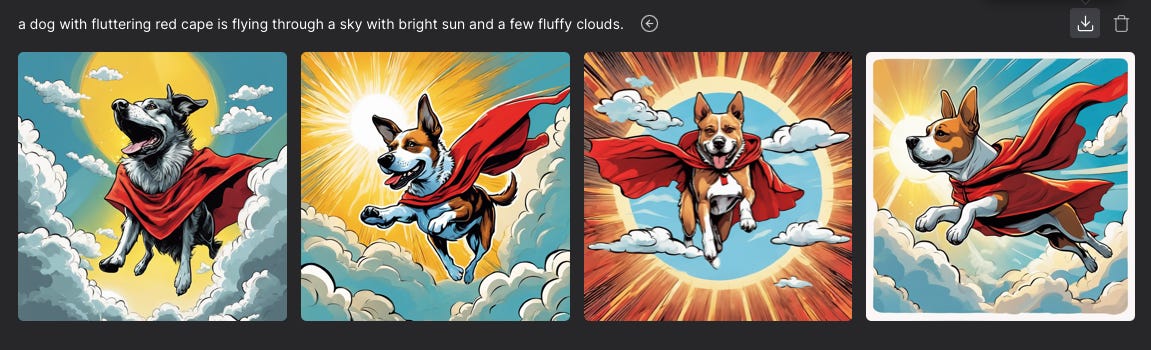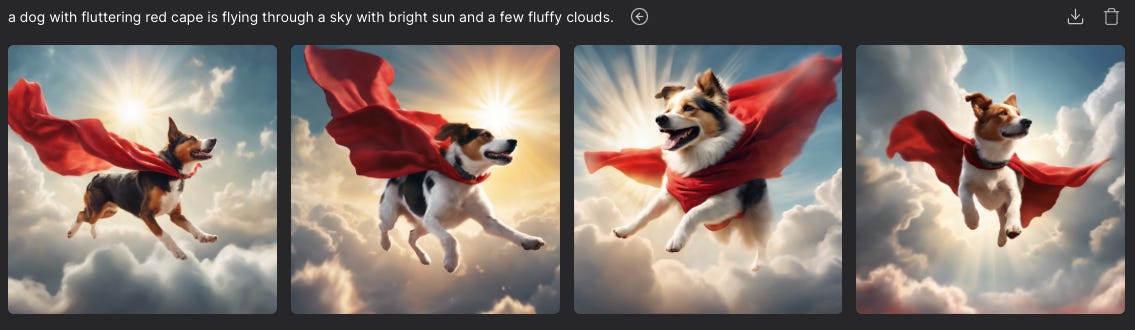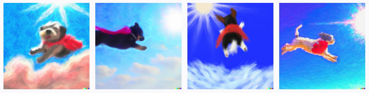 Here is “a heroic dog with a red cape is flying in a sky with bright sun and a few clouds.” Pretty well done.