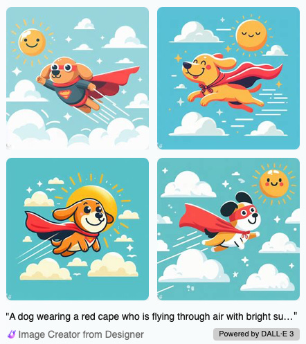 Prompt: “Create an image of a dog wearing a red cape who is flaying through air with bright sun and a few fluffy clouds. Dog seems happy.”