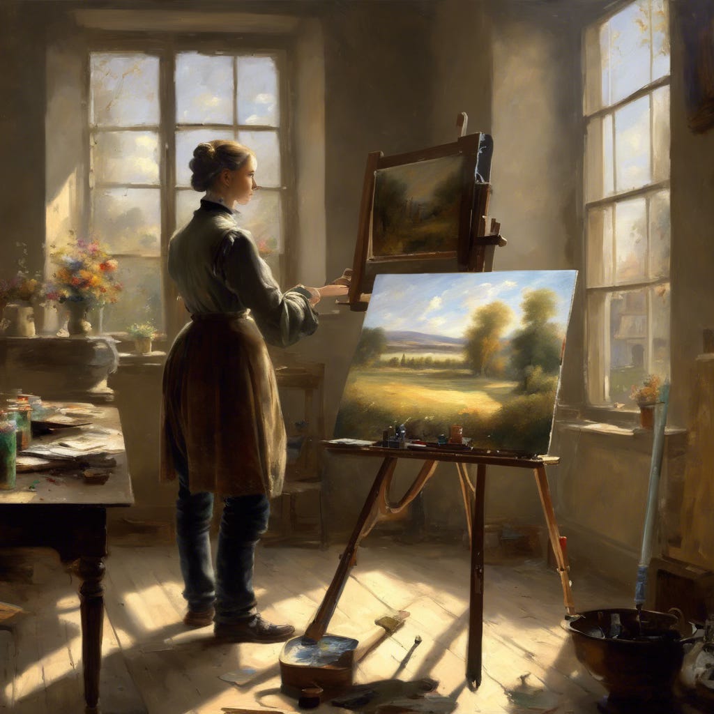 Image generated using the prompt: “Imagine AI as a 19th century French painter painting on an easel with a few fellow painters watching. Put a computer in the background and let bright sunlight shine through a window onto the scene.” Using Dream Studio from Stability.ai.