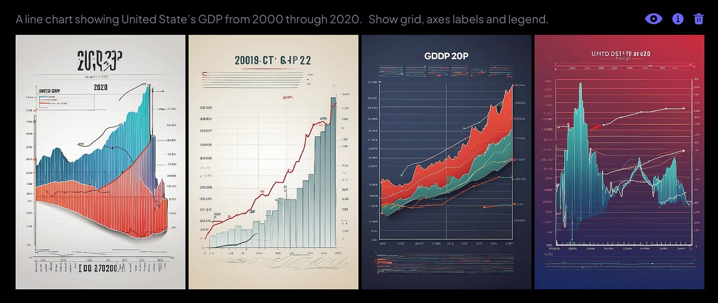 I also asked Leonardo to show me “A line chart showing United State’s GDP from 2000 to 2020. Show Grid, axes, labels, and legend.” Urgh.